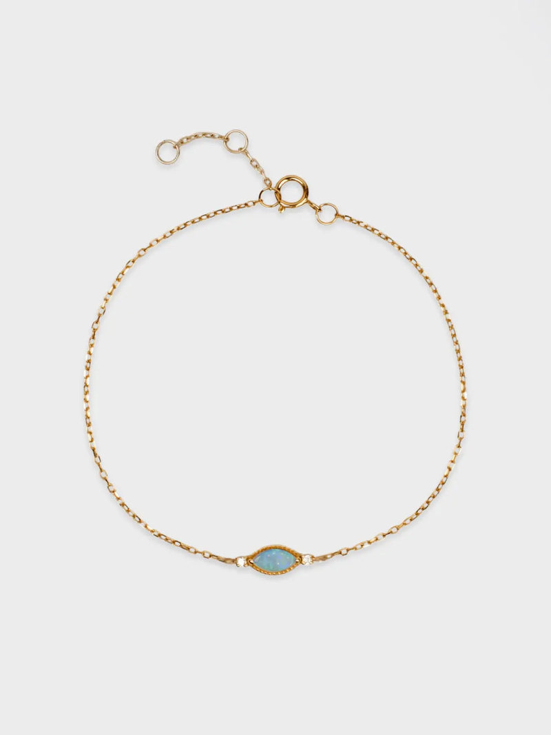 A minimalist opal bracelet with a round cut and four-claw setting, suitable for wearing alone...