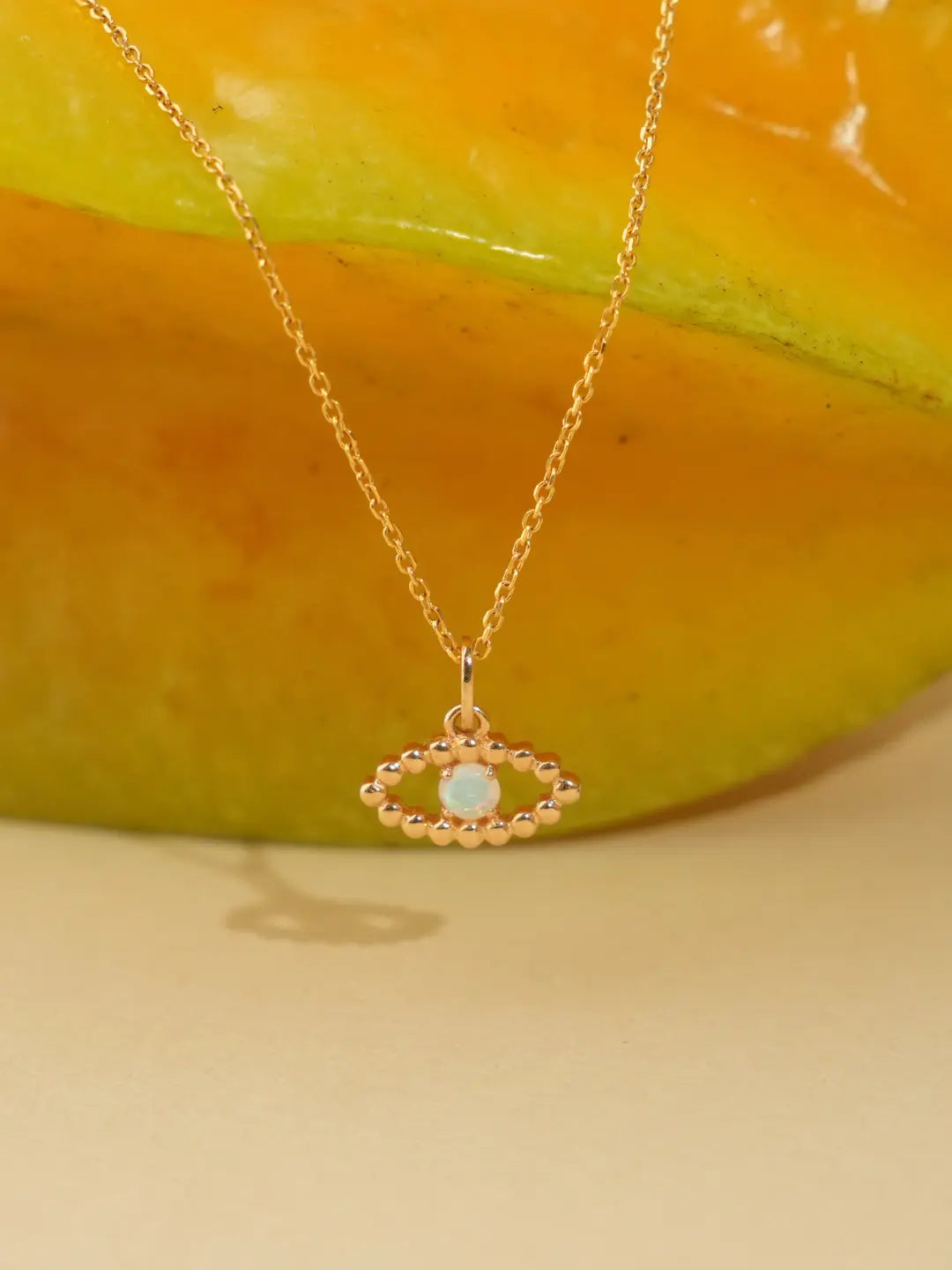This dainty Evil Eye necklace features a round opal set in 14k/18k solid gold. A timeless symbol of protection, it’s perfect for everyday wear or layering with your favorite gold pieces. Elegant, meaningful, and easy to style.