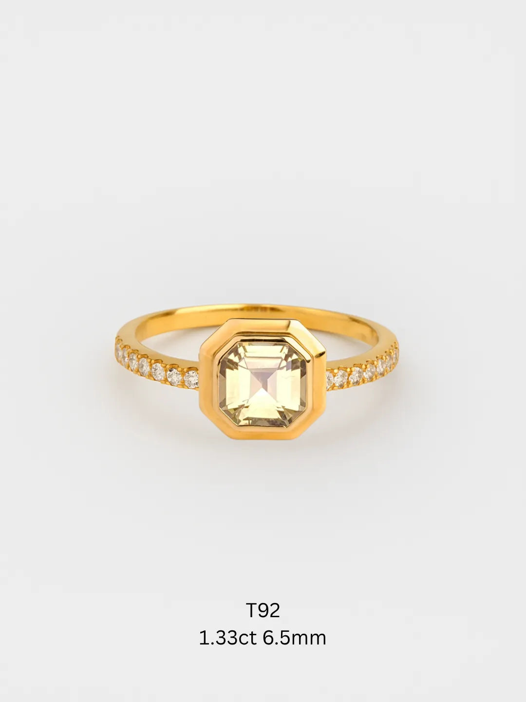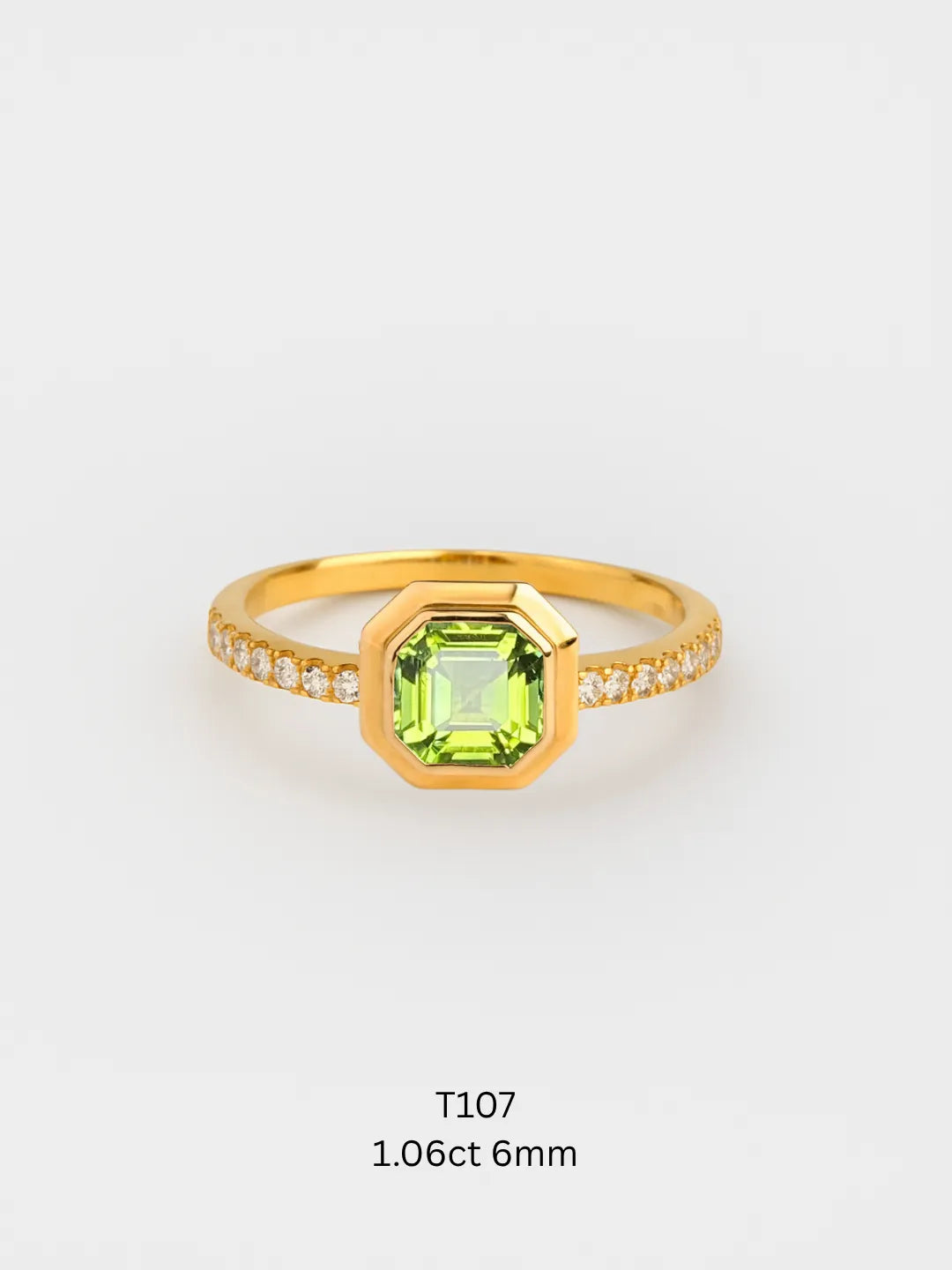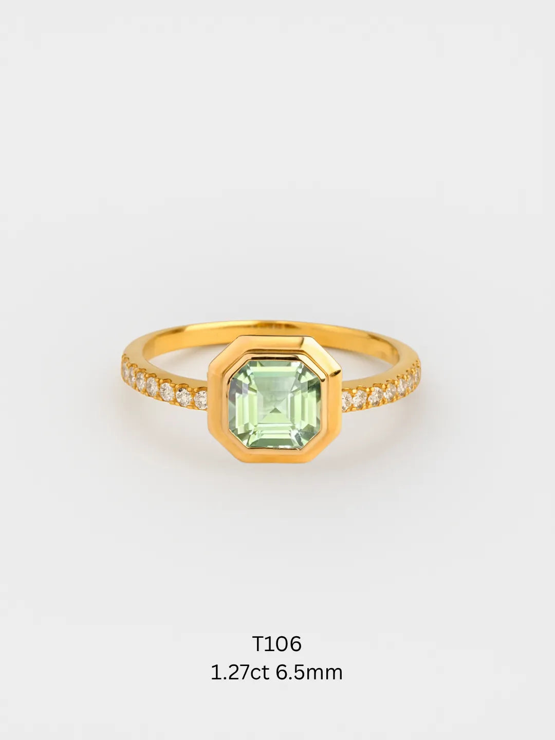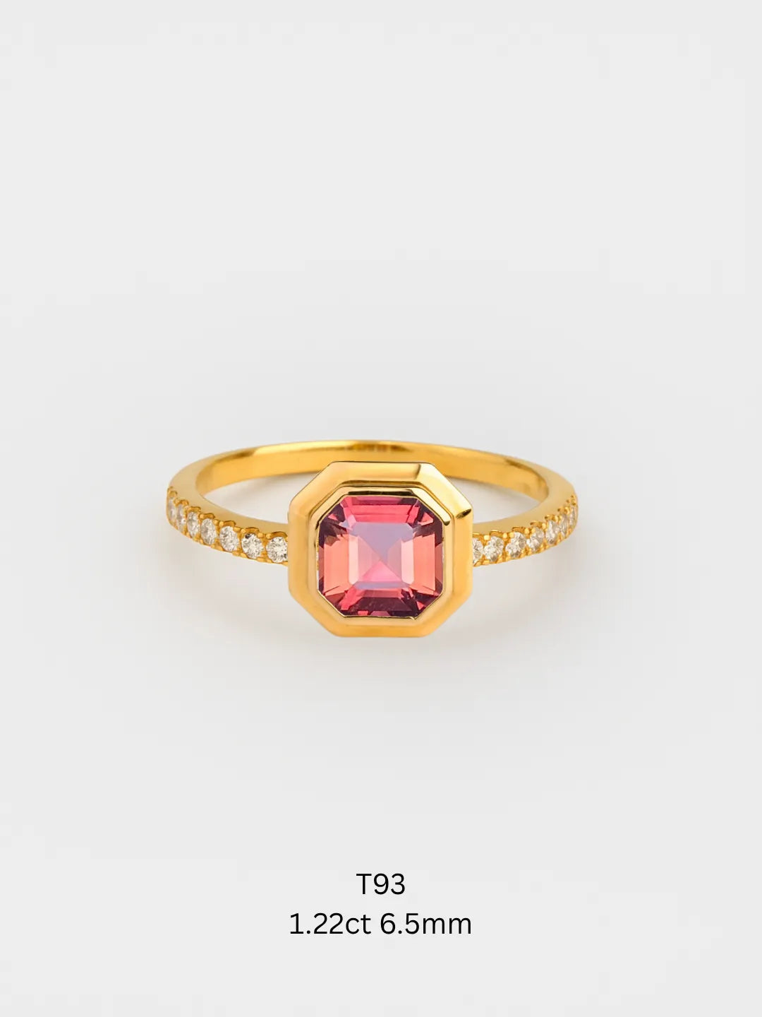Our tourmaline ring showcases the allure of an asscher-cut tourmaline, blending architectural precision and refined sophistication. The bezel setting accentuates the geometric form and depth of the asscher-cut, presenting the tourmaline's hues with clarity. The open-backed design enhances the gemstone's brilliance, creating a structural impression.