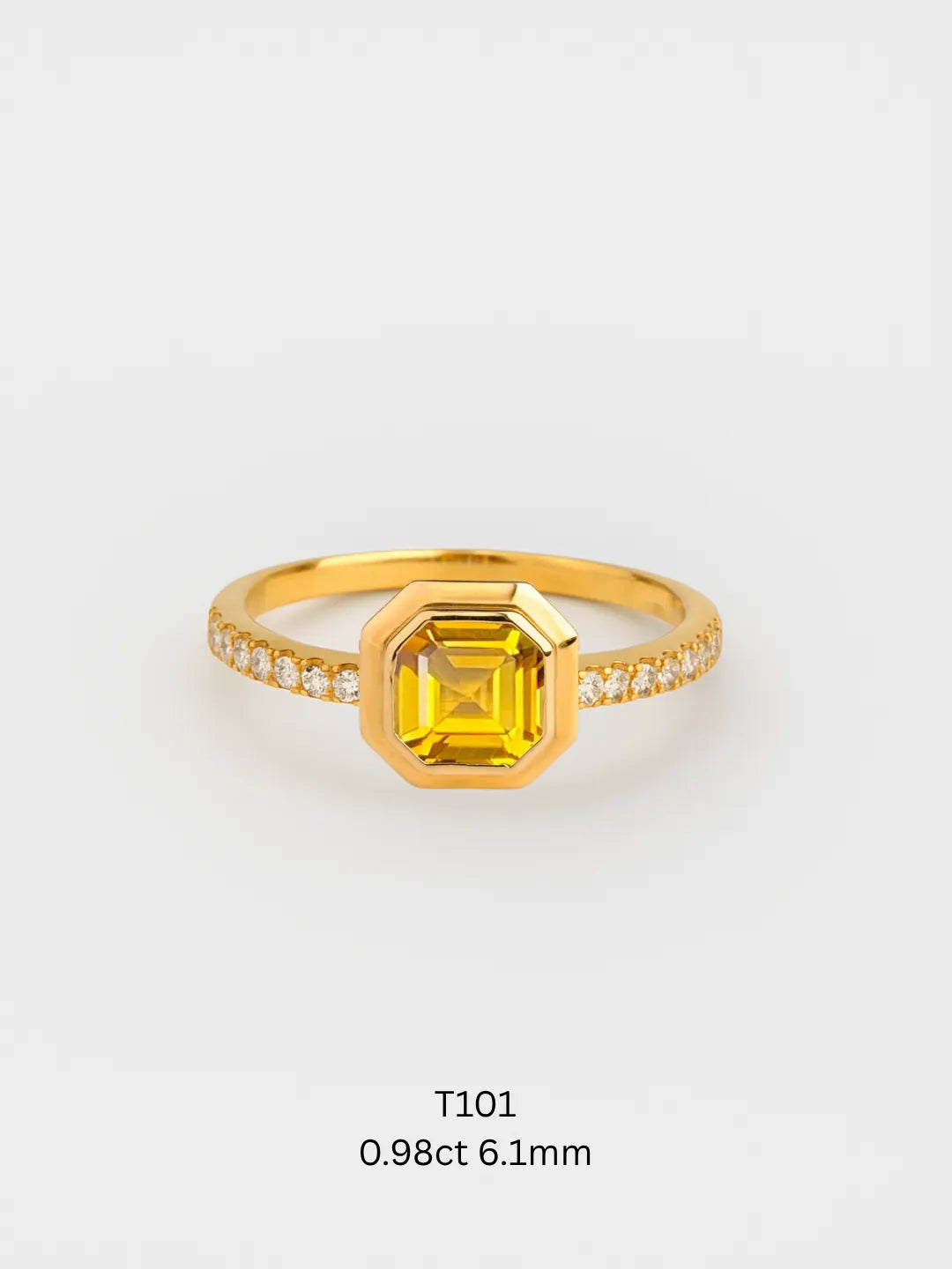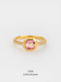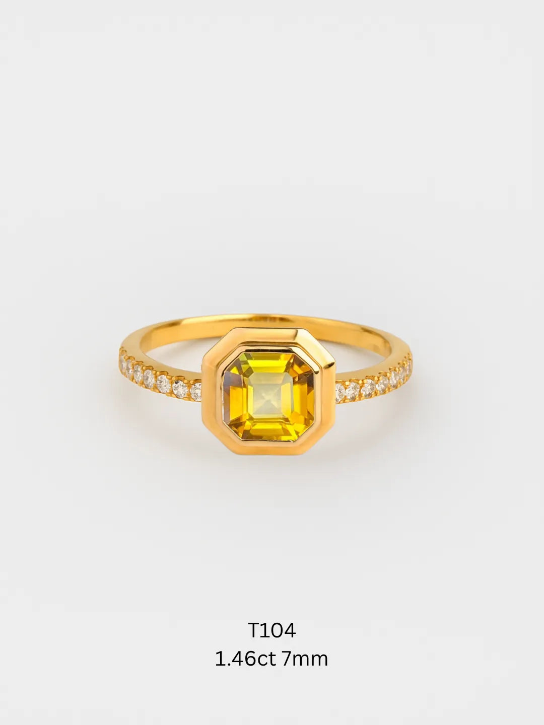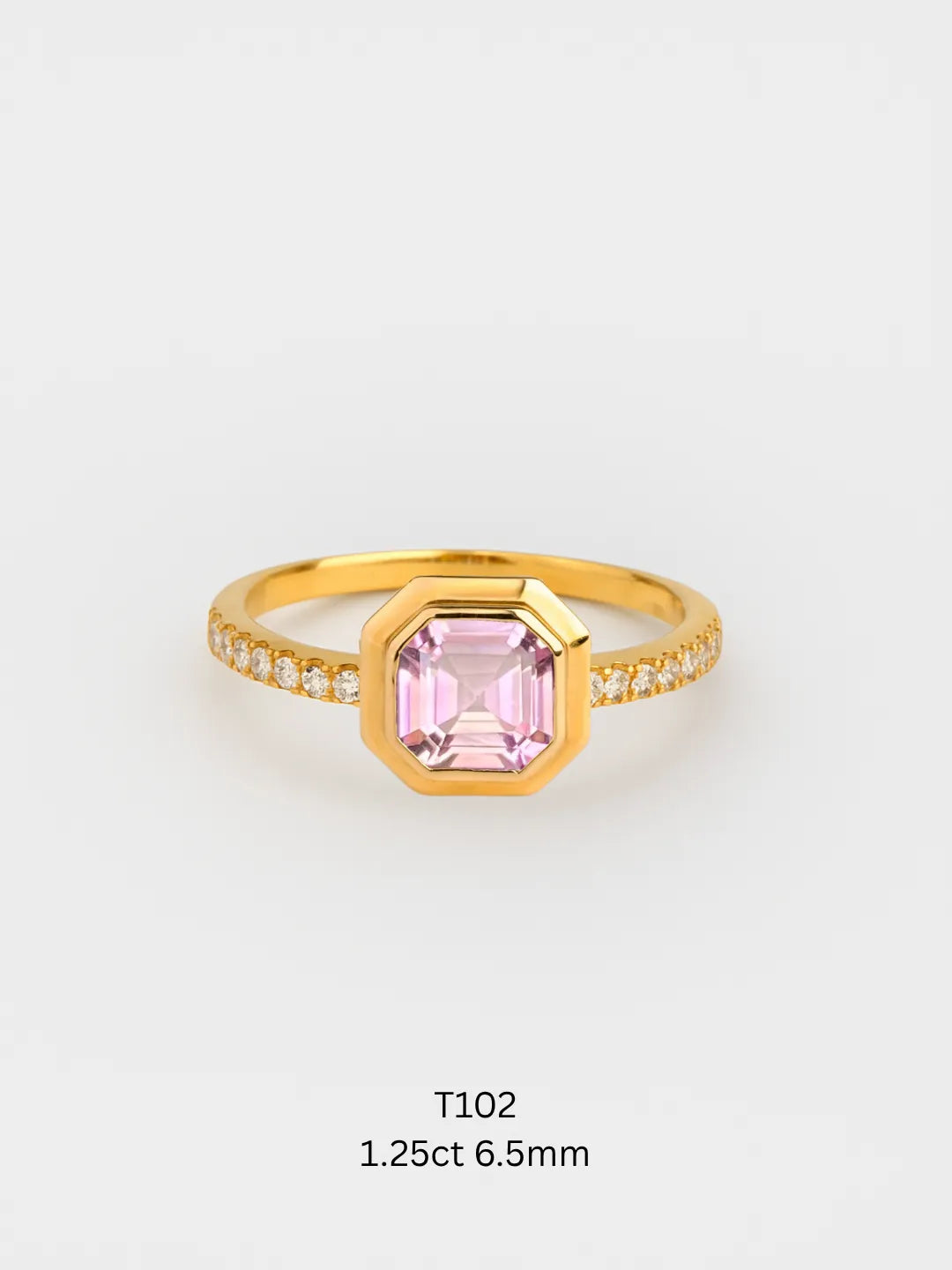 Our tourmaline ring showcases the allure of an asscher-cut tourmaline, blending architectural precision and refined sophistication. The bezel setting accentuates the geometric form and depth of the asscher-cut, presenting the tourmaline's hues with clarity. The open-backed design enhances the gemstone's brilliance, creating a structural impression.