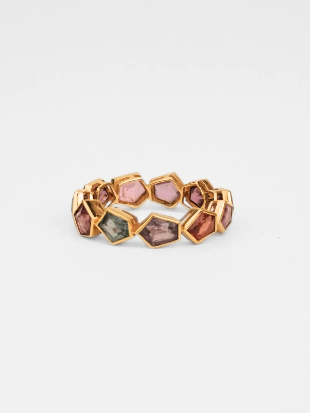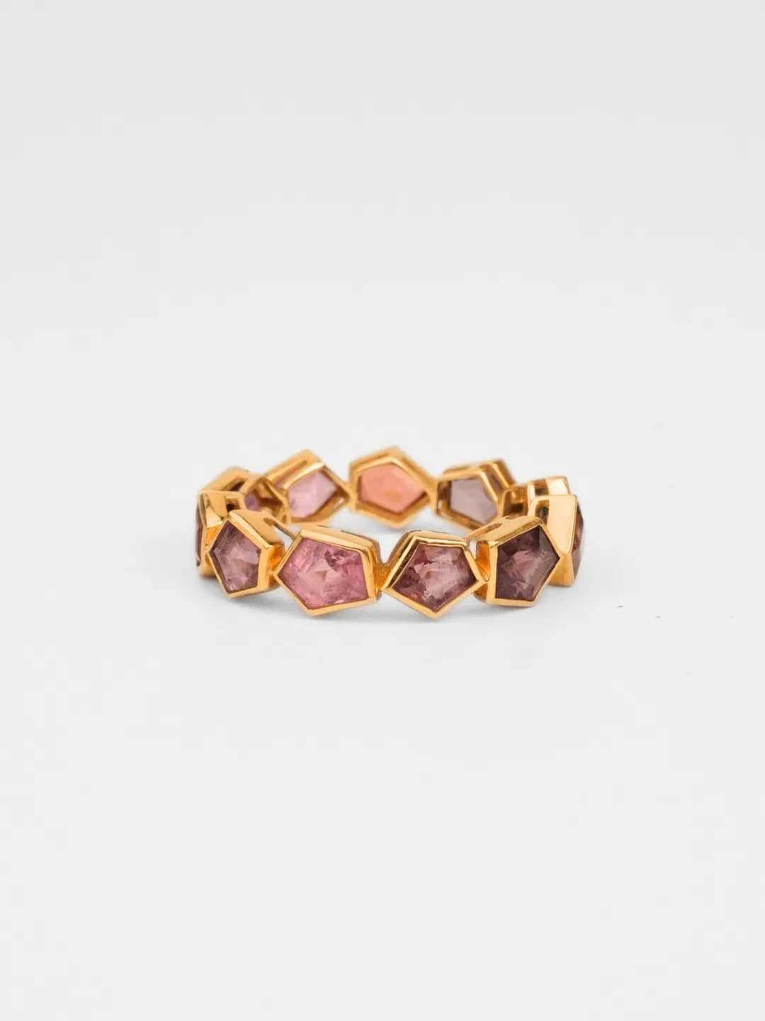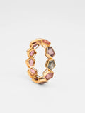 A celebration of individuality and natural beauty, the Aurora Spinel Eternity Band features a dazzling array of hand-selected spinels in soft, earthy tones—from smoky violet and moss green to blush pink and sunset orange. Each gemstone is uniquely cut into freeform pentagon-like shapes, creating an organic, mosaic-like design that feels both contemporary and timeless. No two stones, and no two rings, are ever exactly alike.