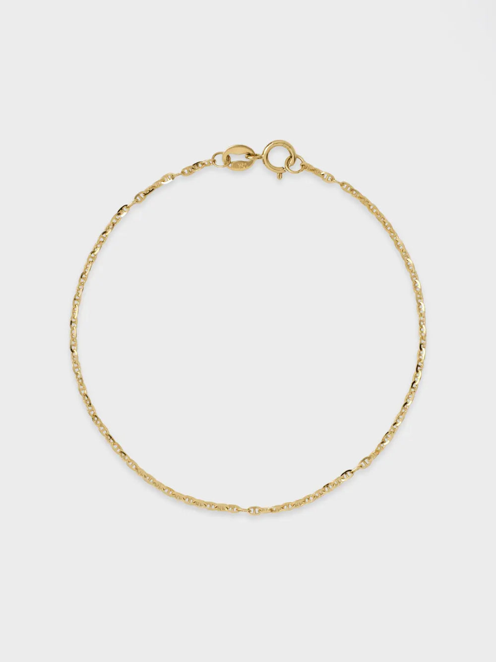 A micro mariner chain bracelet made of 18k gold, can be worn alone or with other bracelets.