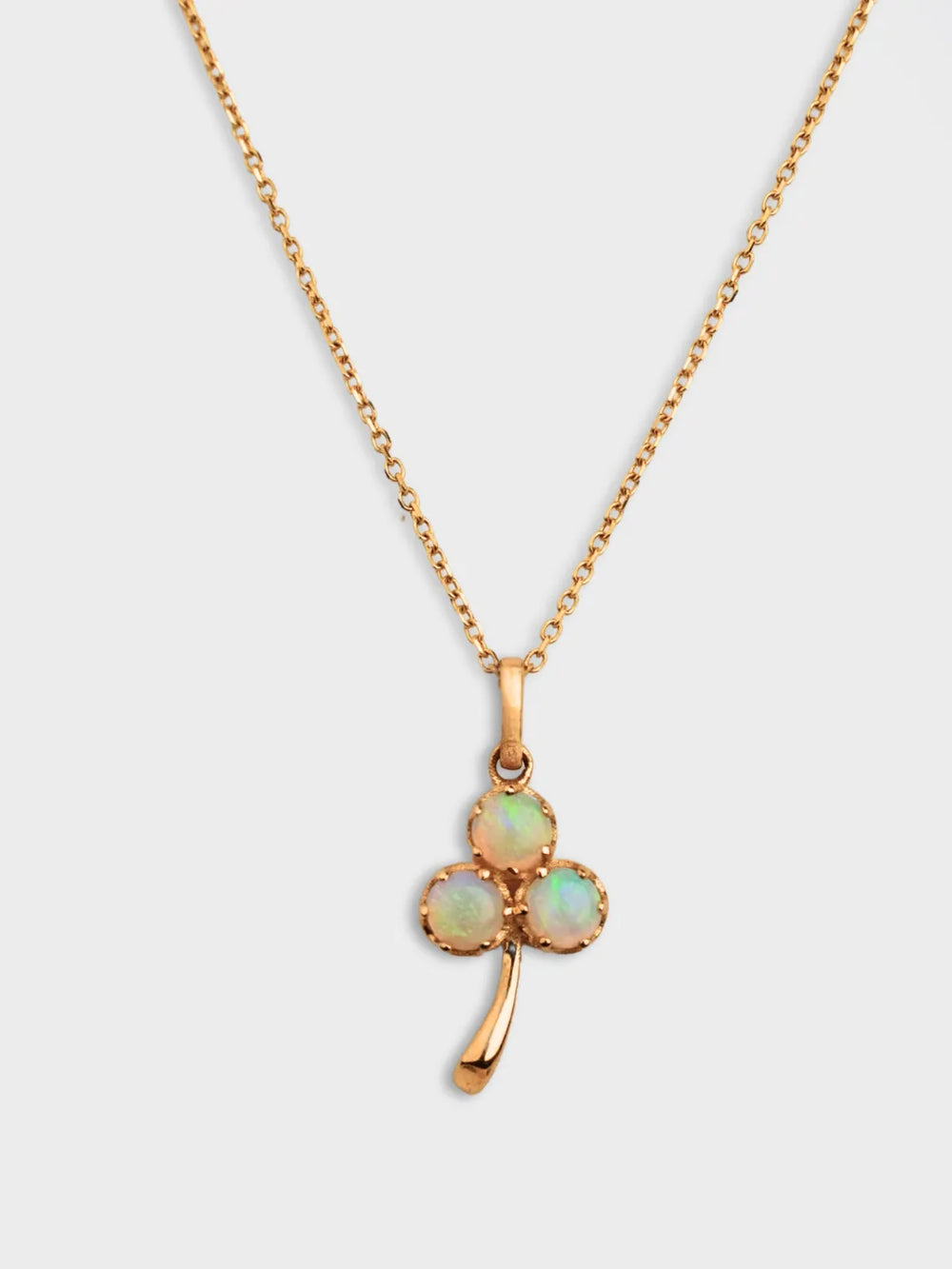 Bring a touch of luck and luminous beauty to your style with this clover opal necklace. Three shimmering opals glow with flashes of color, set in a delicate gold clover design that symbolizes hope and good fortune. A perfect everyday piece or a thoughtful gift for someone special.