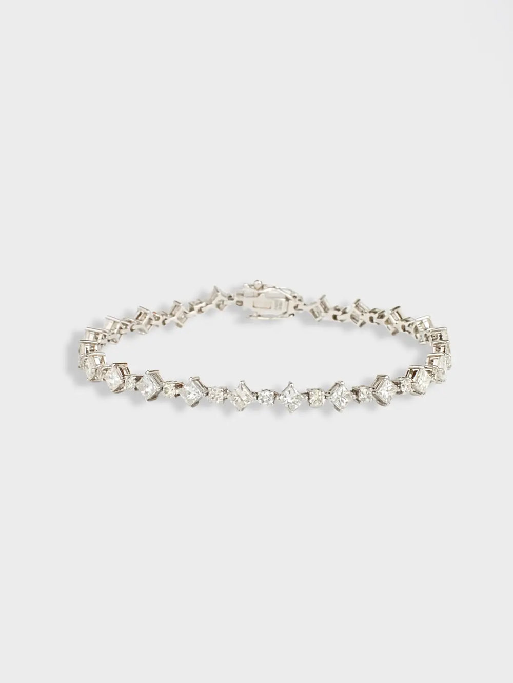 Crafted in lustrous 14K/18K white gold, this exquisite tennis bracelet artfully alternates between crisp square-cut diamonds and luminous round brilliants, creating a mesmerizing play of light and structure. Each precisely set stone ensures seamless flexibility, while the contrasting cuts—angular elegance paired with timeless sparkle—offer a modern twist on a classic design.