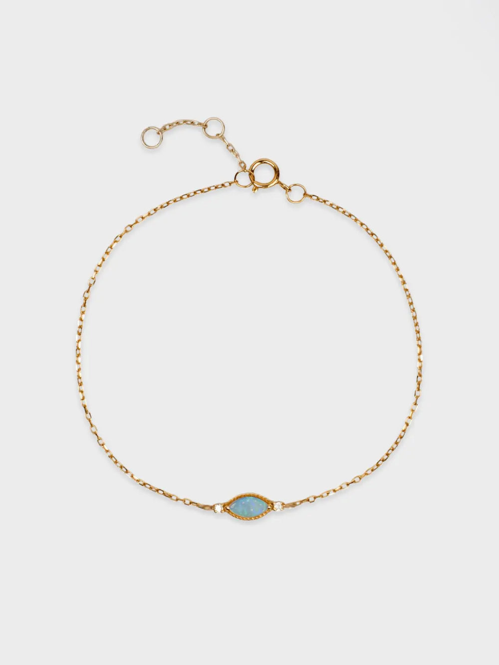 A minimalist opal bracelet made of an marquise opal and two small diamonds, suitable for wearing alone or stacked with other bracelets.