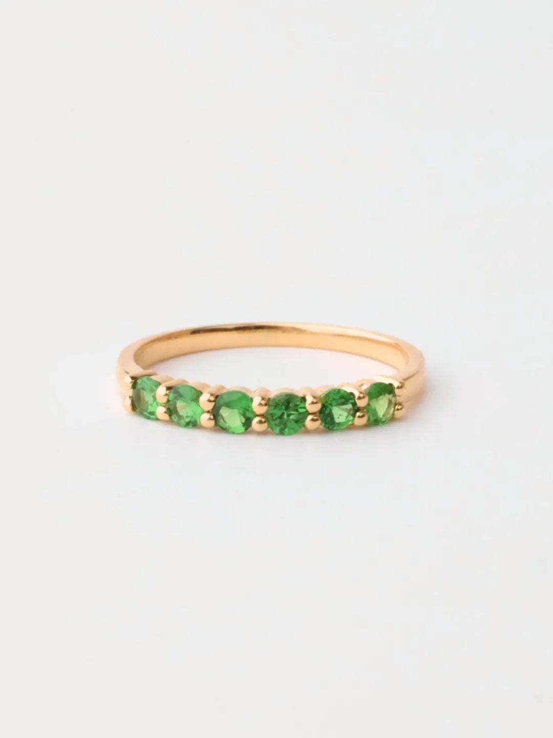 Set with a row of vivid green tsavorite garnets/red rubies/deep blue sapphires, this minimalist band is crafted in solid 14k/18k gold. Its slim, timeless silhouette makes it perfect for stacking or wearing alone as a subtle pop of color. A fresh and elegant piece for everyday wear or special moments.
