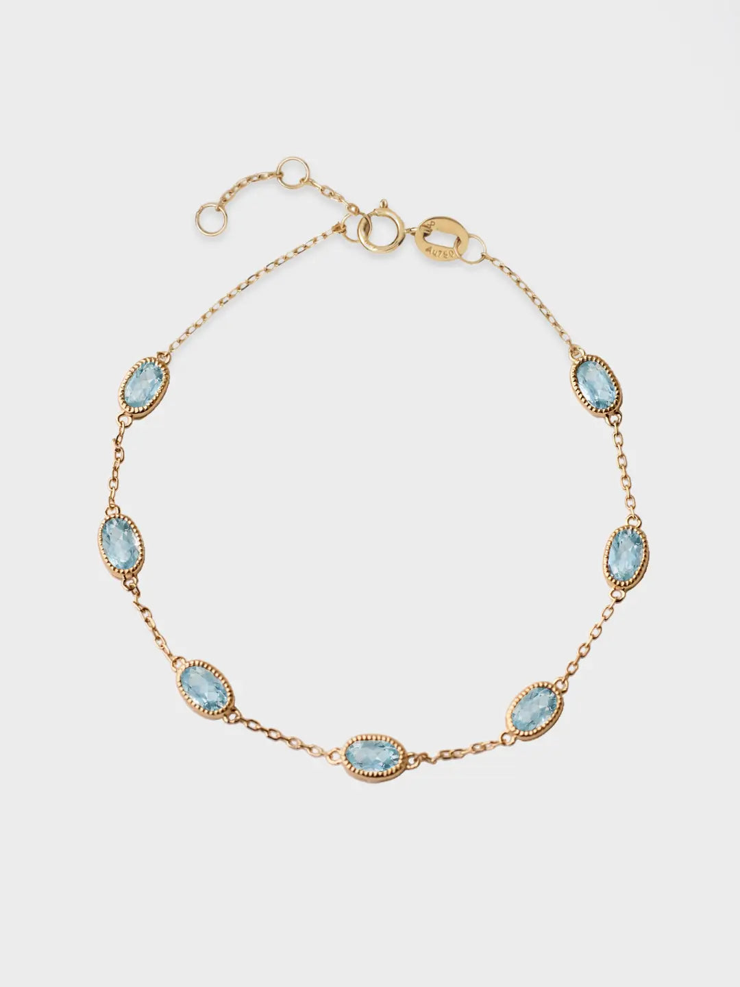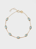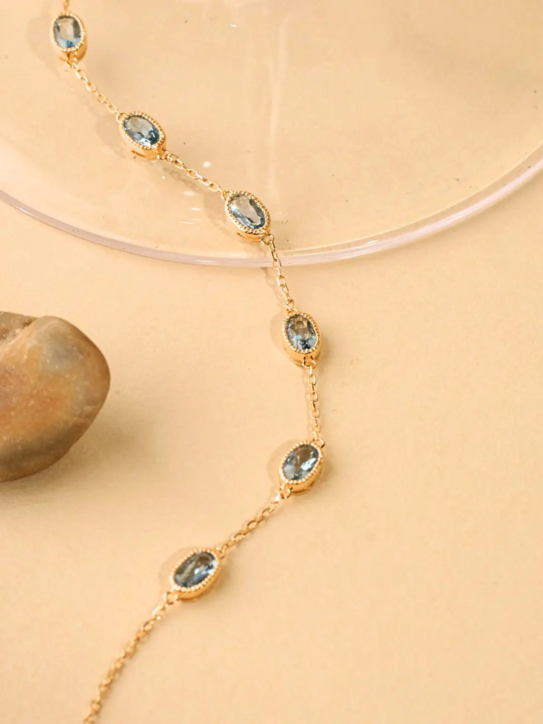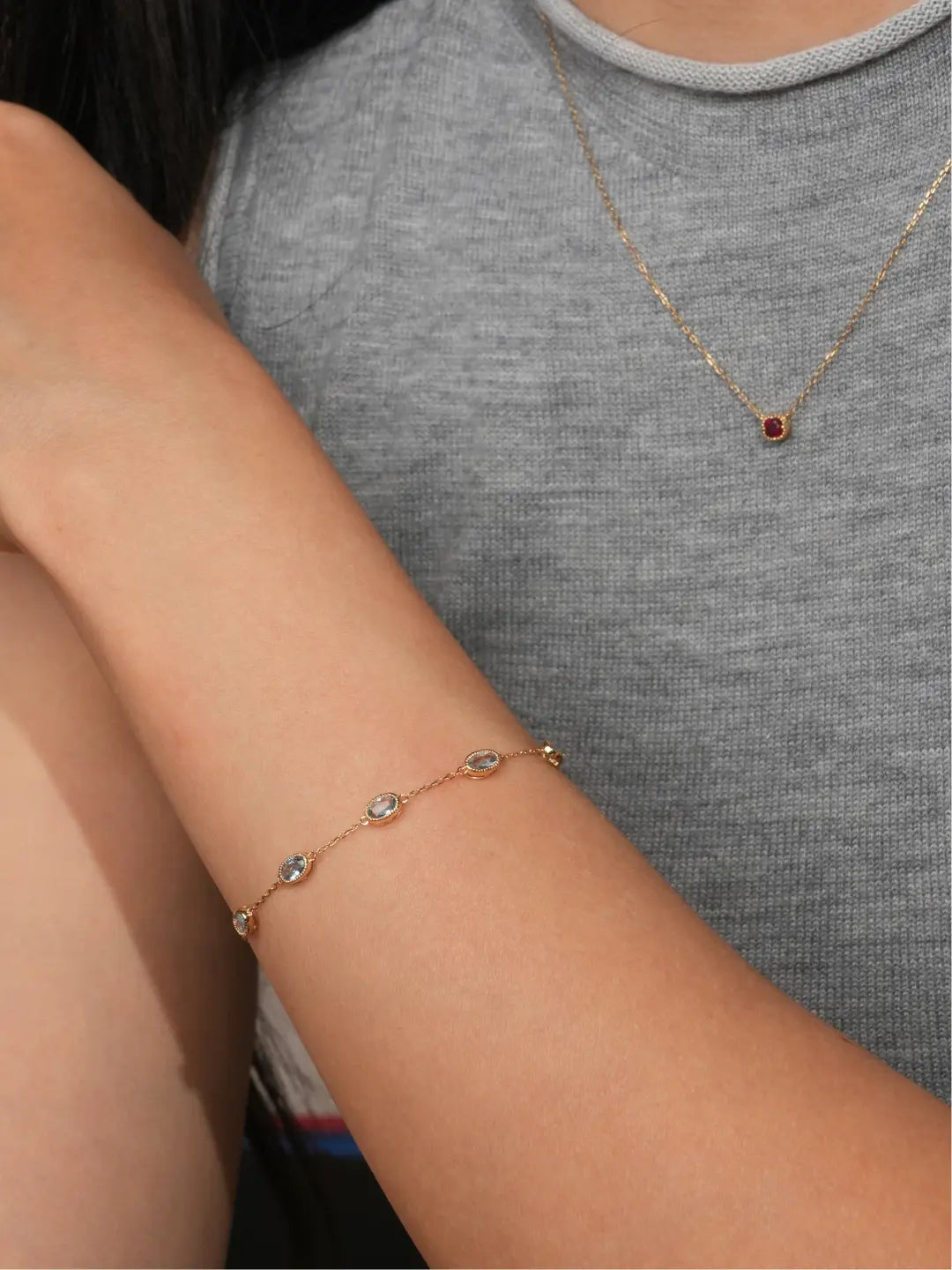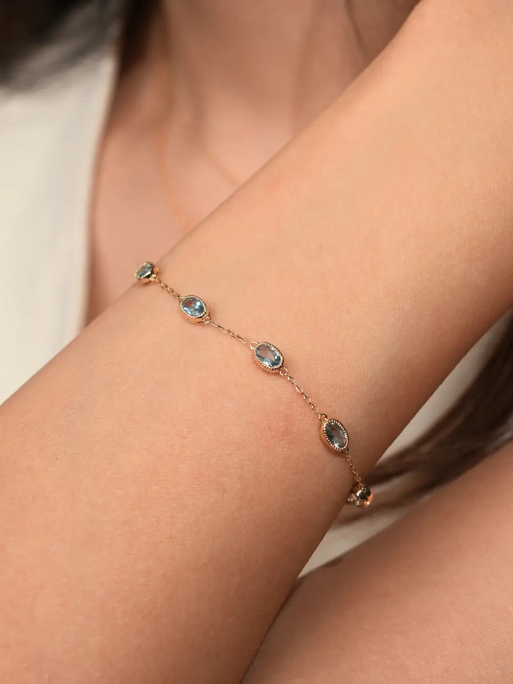 Experience the serenity of deep-sea aquamarine with our 7-stone Oval Multi-Stone Bracelet. Adorned with a minimalist bezel, each gem exudes natural elegance and can be worn alone or layered for a touch of sophistication to any outfit.