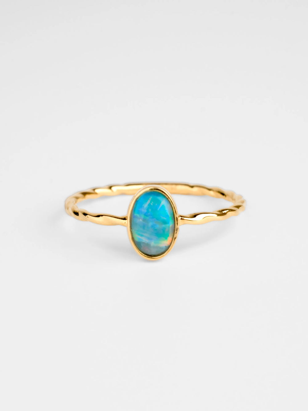 A delicate oval opal ring with a closed-back setting and a smooth, flowing thin band. Perfect for adding a luminous touch of understated elegance to any look.