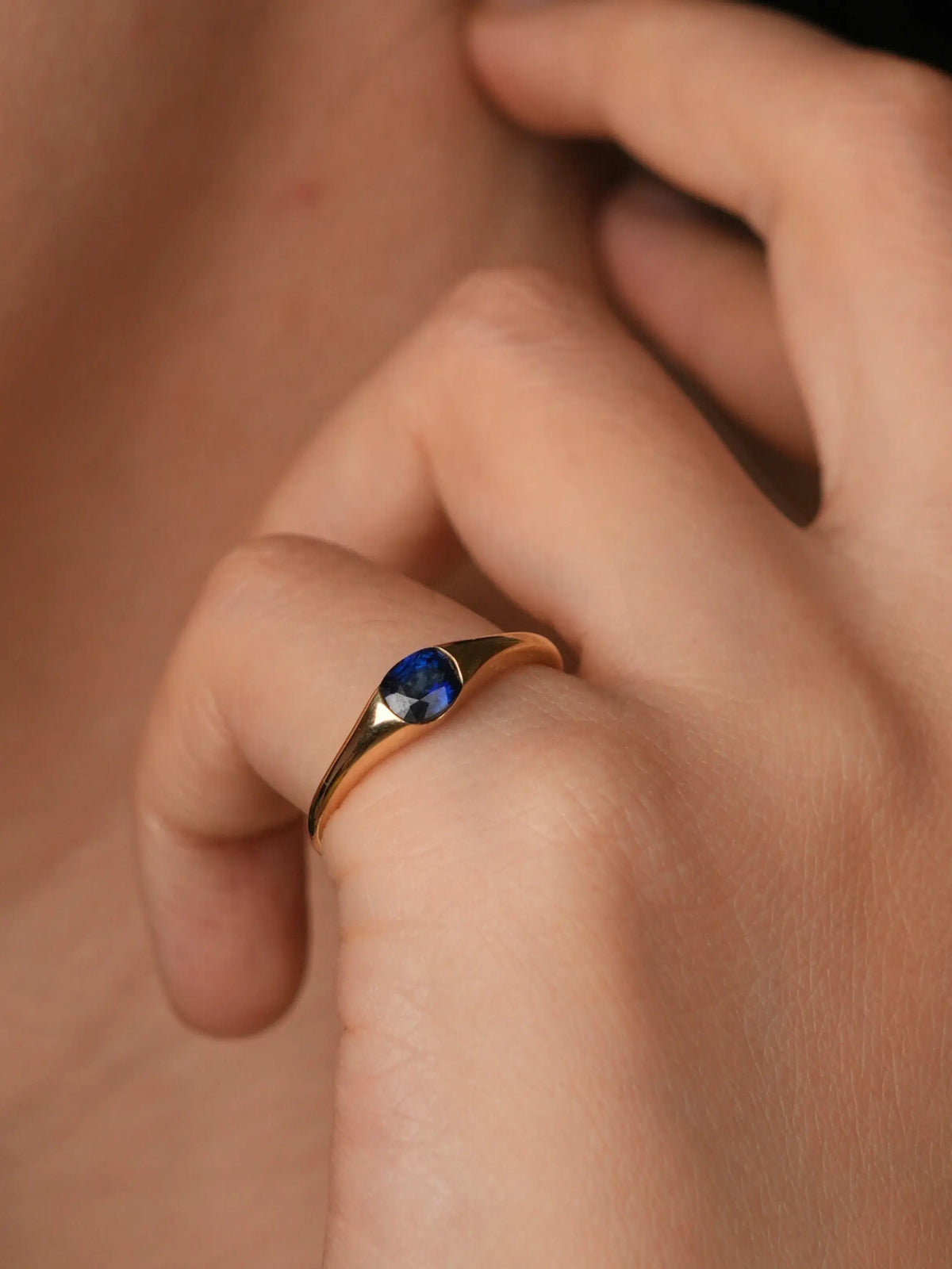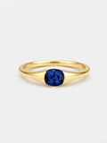 An oval sapphire set in a semi-bezel, on a tapered 14K/18K gold band. Classic design for daily wear.