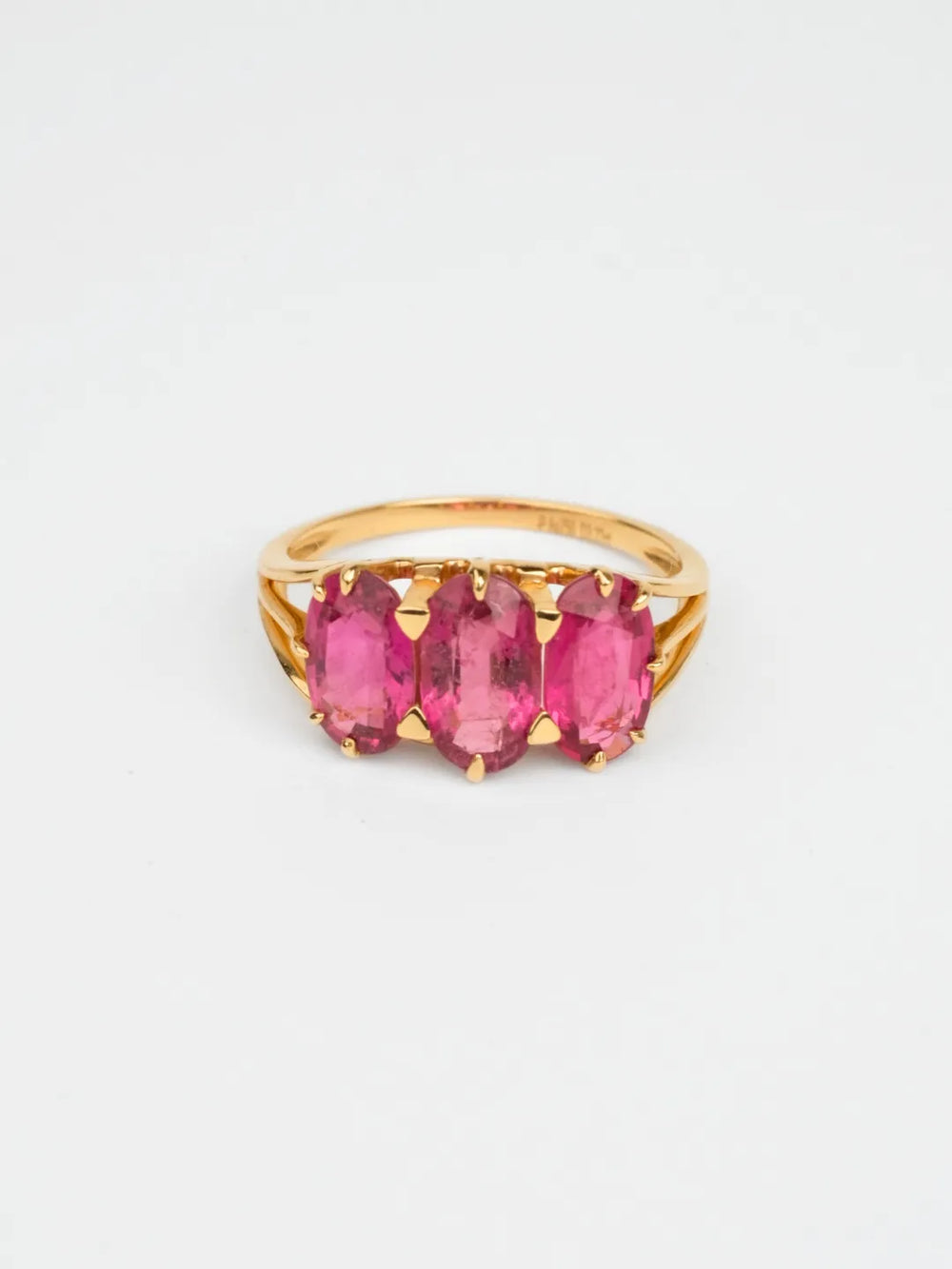 This elegant three-stone ring features three oval-cut rubellite tourmalines set in a polished 18K gold band. The vibrant pink-red gemstones create a bold and timeless look, making it a perfect piece for both everyday wear and special occasions.