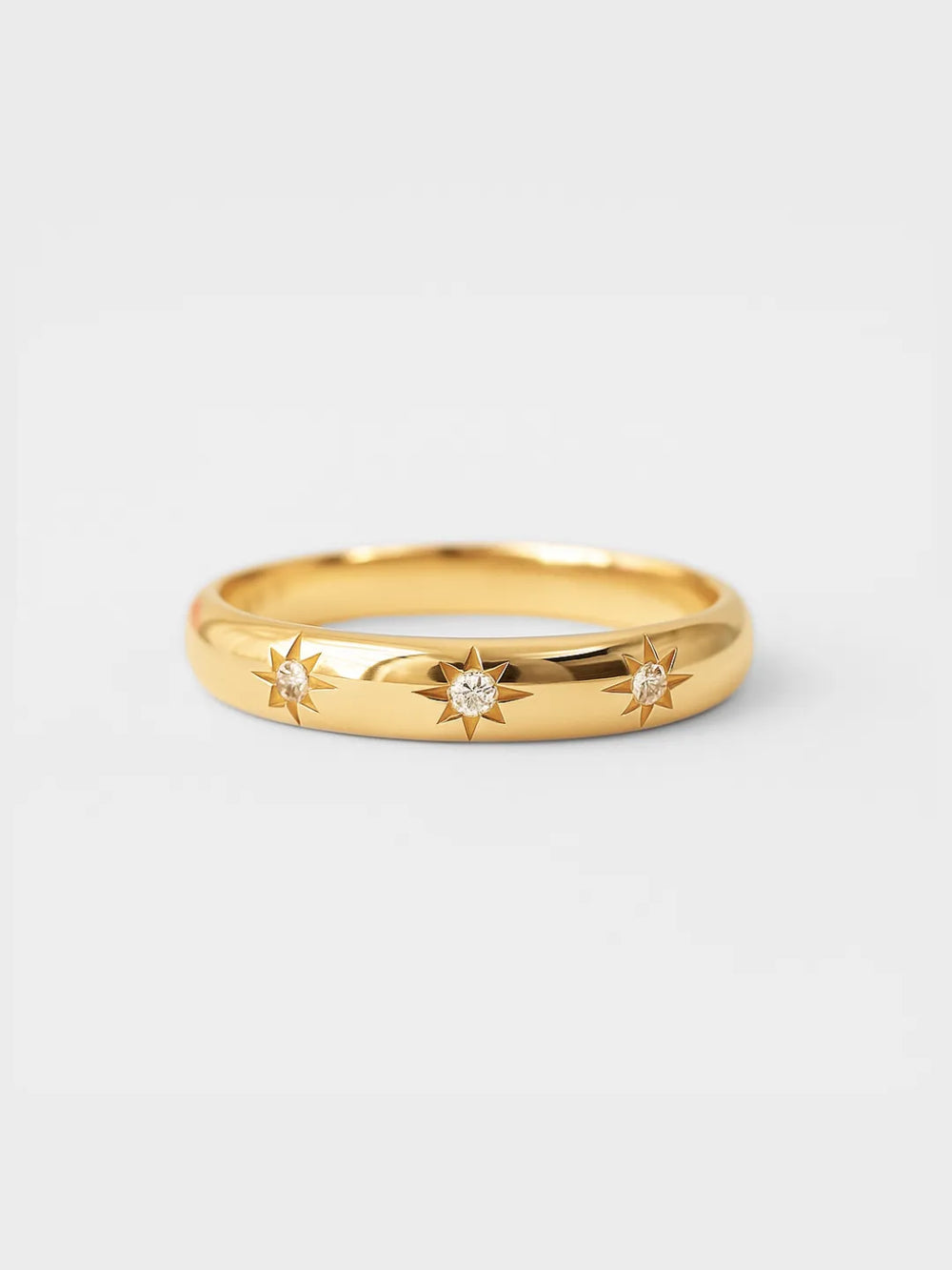 The Trinity Star Diamond Ring features three finely engraved eight-pointed stars, each centered with a brilliant diamond that catches light from every angle.