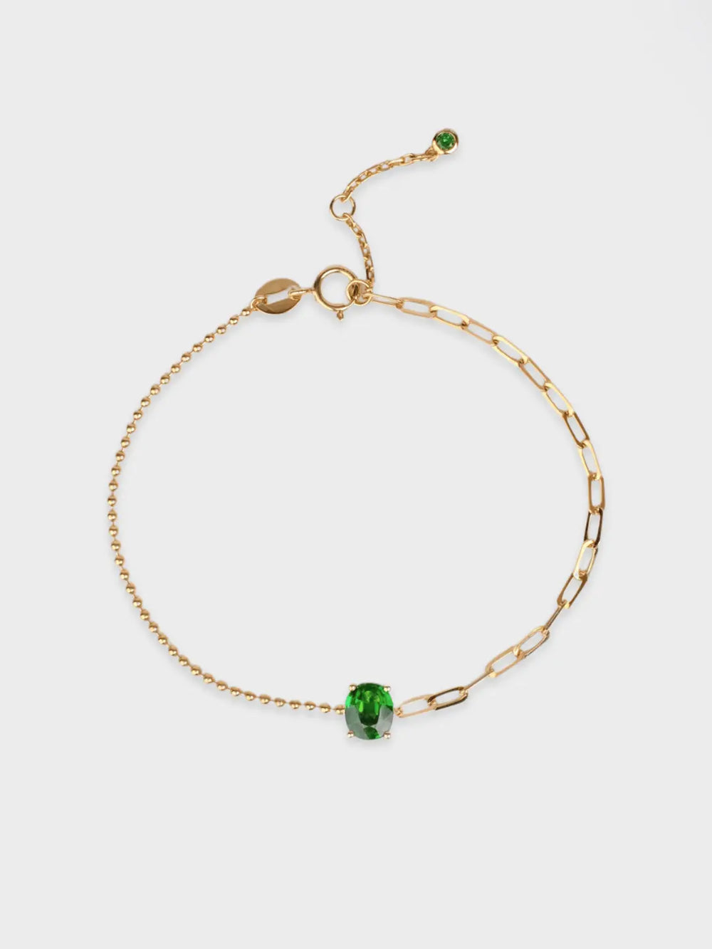 This captivating Asymmetrical bracelet pairs an oval Tsavorite centerpiece with a harmonious blend of classic paperclip chain and dot chain, creating a distinctive interplay of elegance and modern style. Whether worn alone or layered with other accessories, this bracelet will become a truly unique statement piece in your collection.