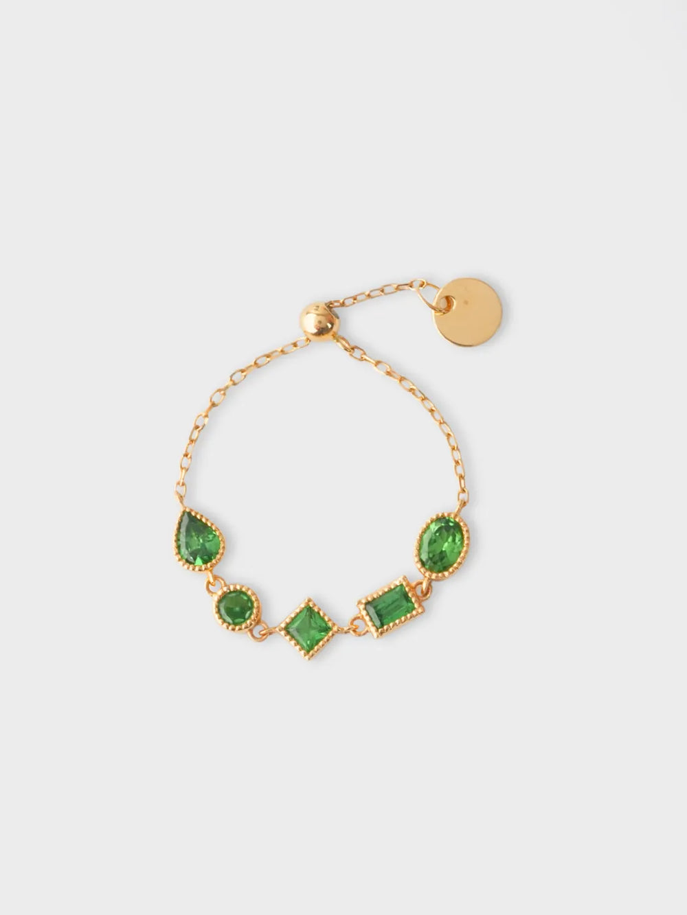 Vibrant and playful, this adjustable ring showcases pear, round, square, and emerald-cut tsavorites set on a delicate 14k/18k solid gold chain. The sliding closure ensures a secure, custom fit—perfect for effortless, everyday elegance.